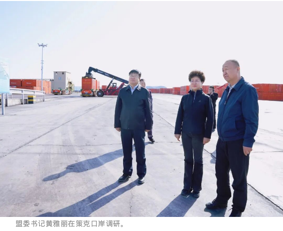在策克口岸,黃雅麗調研了AGV無人駕駛跨境運輸、過貨通道、邊民互市貿易等情況。她說,口岸通關過貨能力、綜合配套功能都有了新變化,要更大力度推進口岸現代化、智慧化、多元化發展,持續深化擴大AGV運輸應用,加快推進跨境鐵路等重大項目前期,全力做優做旺邊民互市貿易,大力發展落地加工、現代物流、跨境旅游等產業,切實把通道優勢轉化為經濟發展優勢。